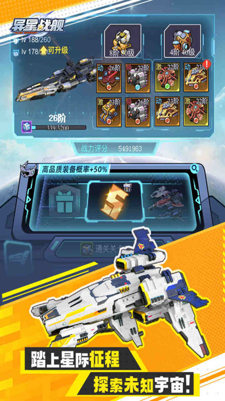 《异星战舰》是一款放置太空冒险手游。进入游戏,你只需要轻点开炮攻击BOSS,即可获得装备,同时获得超合金与开炮经验。所有奖励都是主舰成长必需品,简单操作,无限成长!